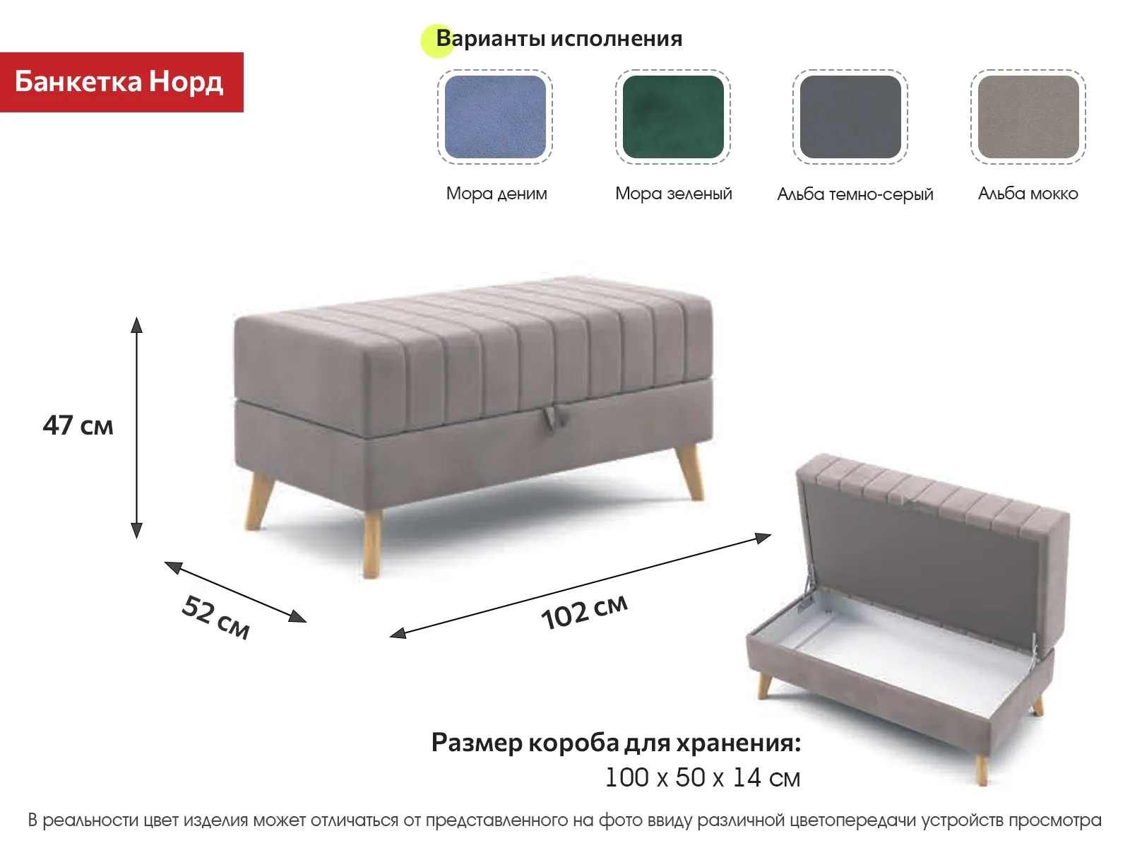 Банкетка НОРД удобна не только как дополнение к дивану НОРД, но и как самостоятельный предмет мебели. Широкая, комфортная, с независимым пружинным блоком и вместительным коробом для хранения служит не только местом для комфортного сидения, но и позволяет разместить необходимые вещи внутри.