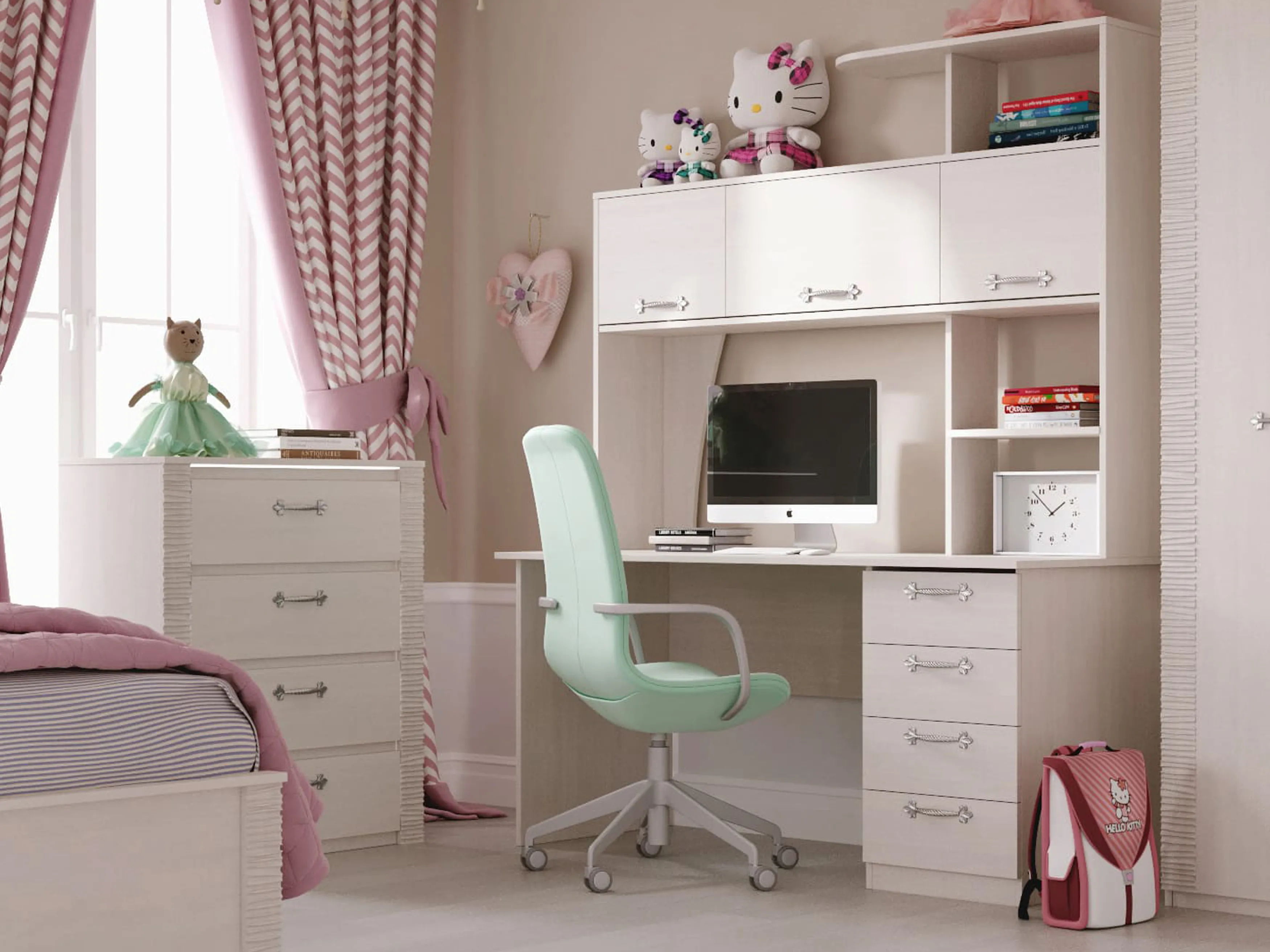В состав коллекции входят: шкаф однодверный, шкаф угловой, шкаф двухдверный, комод, стол компьютерный, тумба прикроватная, кровать.