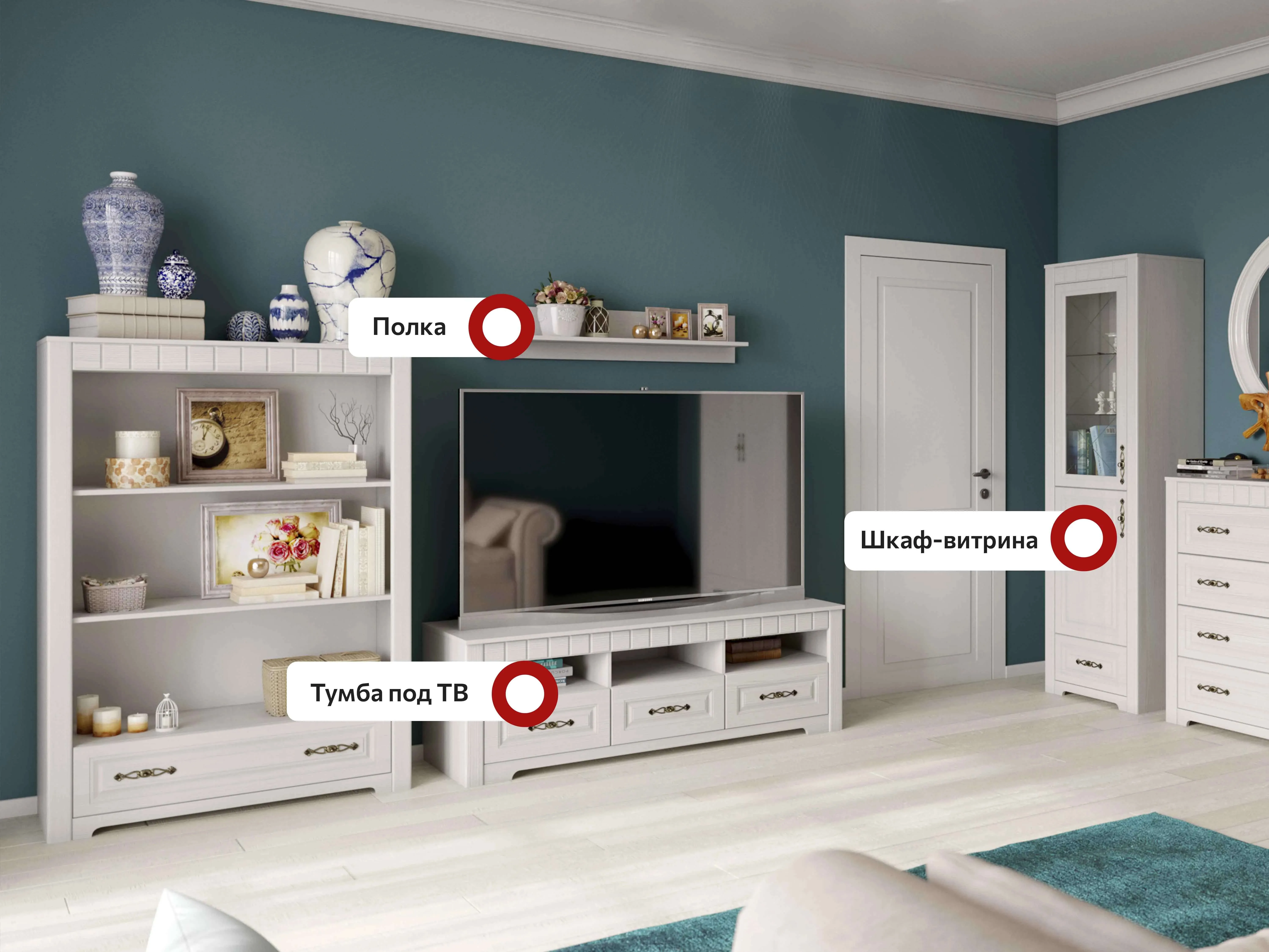 В серию "Прованс" входят: шкаф двухдверный, шкаф-витрина, стеллаж, комод, тумба ТВ, полка навесная.