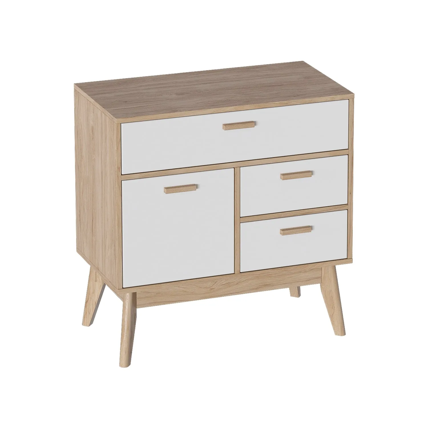 Небольшие размеры позволяют разместить этот интерьерный предмет как в компактной прихожей, так и в любом другом помещении. Корпус комода выполнен из ЛДСП цвета натурального дуба, фасады - из белоснежного матового МДФ. Высокие опоры из массива березы облегчают уборку и делают комод легким в интерьере. Ручки выполнены из массива березы.