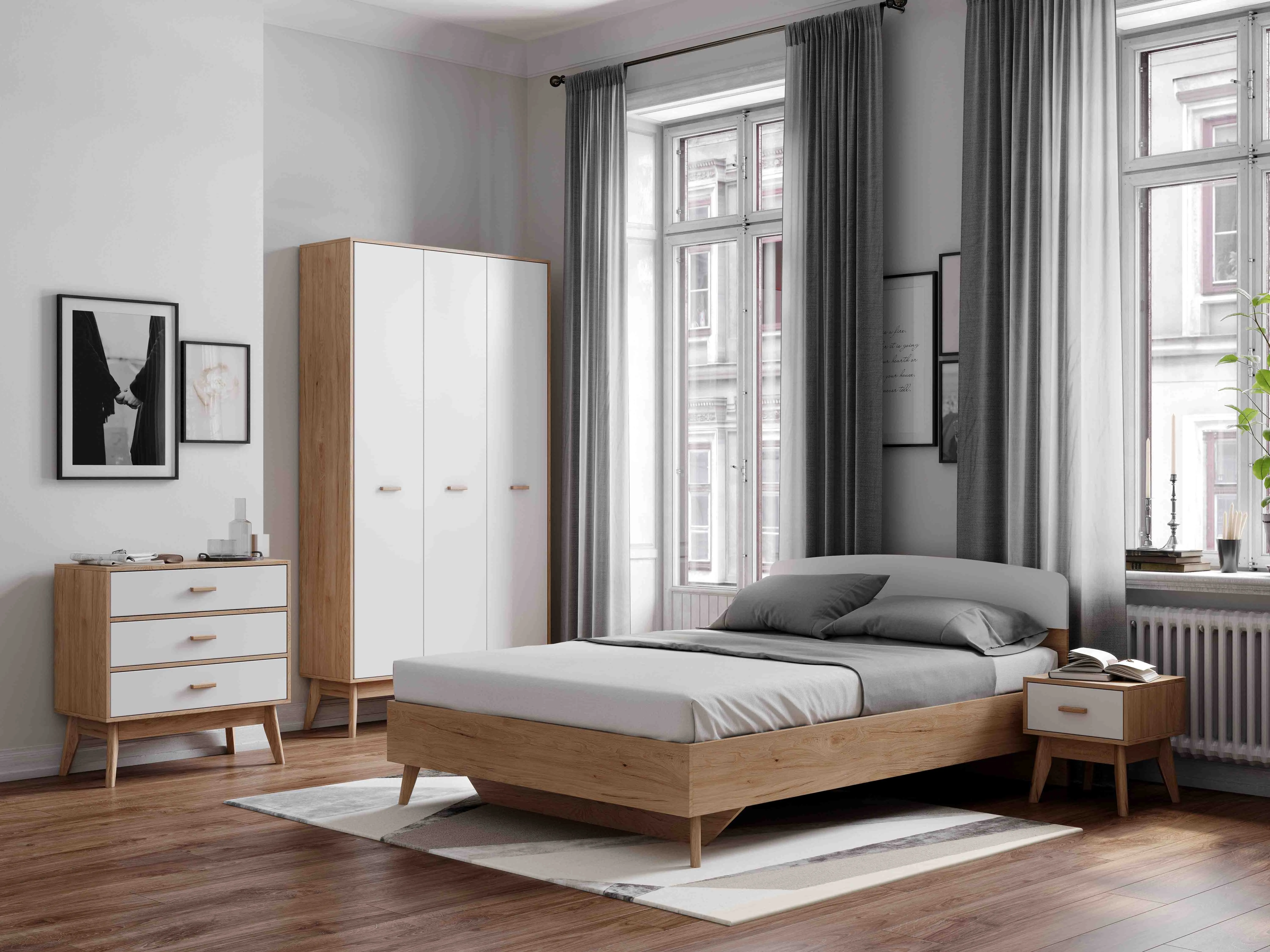 Корпус изготовлен из ЛДСП толщиной 16 мм в цвет натурального дуба, белая накладка в изголовье - из МДФ толщиной 16 мм. Опоры сделаны из натурального массива березы. Высота опор 25 см. Высота спального места 38 см. Рекомендуемая высота матраса 16-25 см. В комплект кровати входит прочное ортопедическое основание на березовых ламелях. Максимальная нагрузка на одно спальное место составляет 150 кг.
