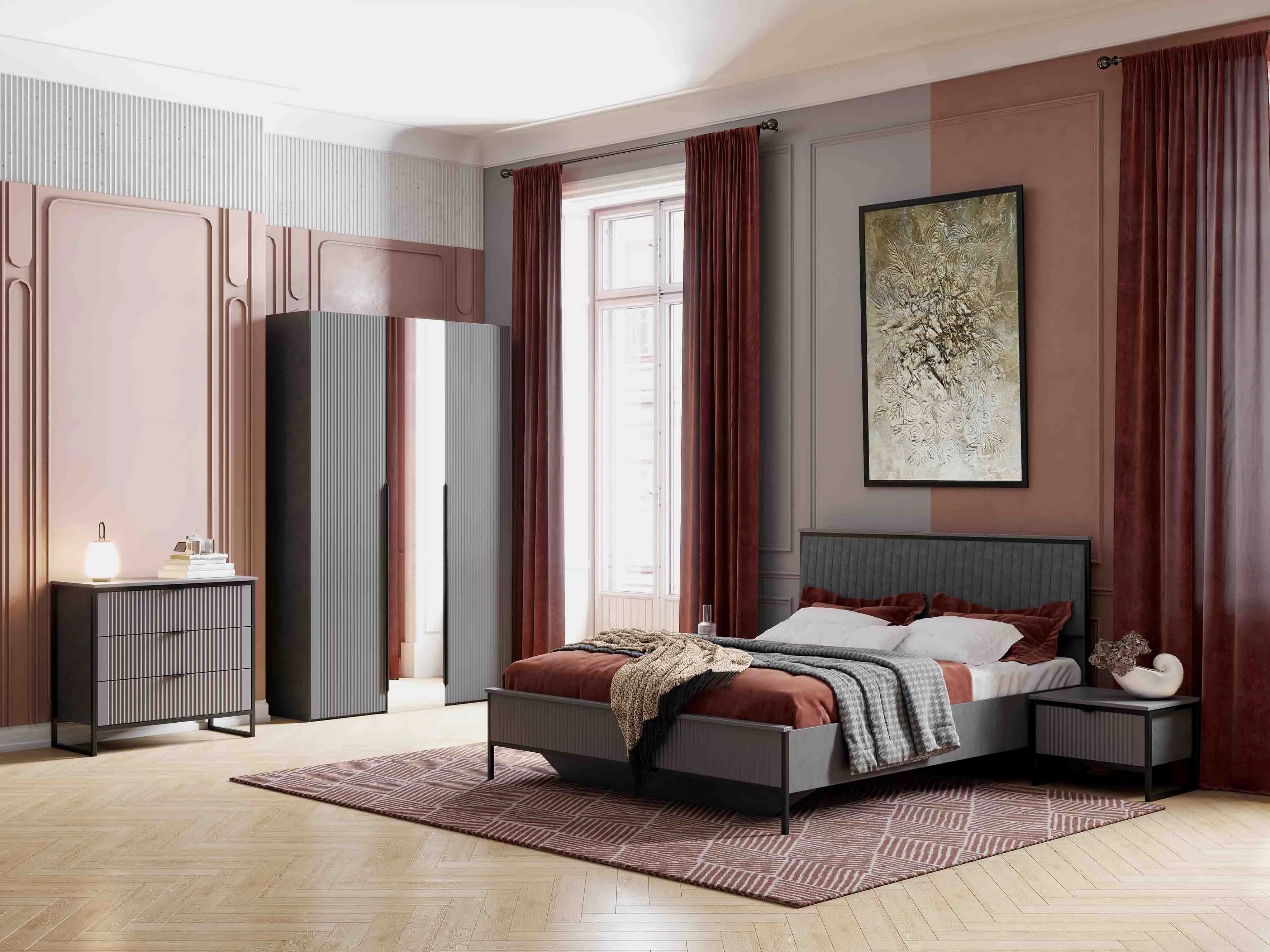 Коллекцию модульной спальни "Нора" отличает современный оригинальный стиль. Декоративная продольная фрезеровка на МДФ фасадах и опоры на металлокаркасе цвета черная эмаль соответствуют модным тенденциям этого года в ведущих зарубежных коллекциях.
