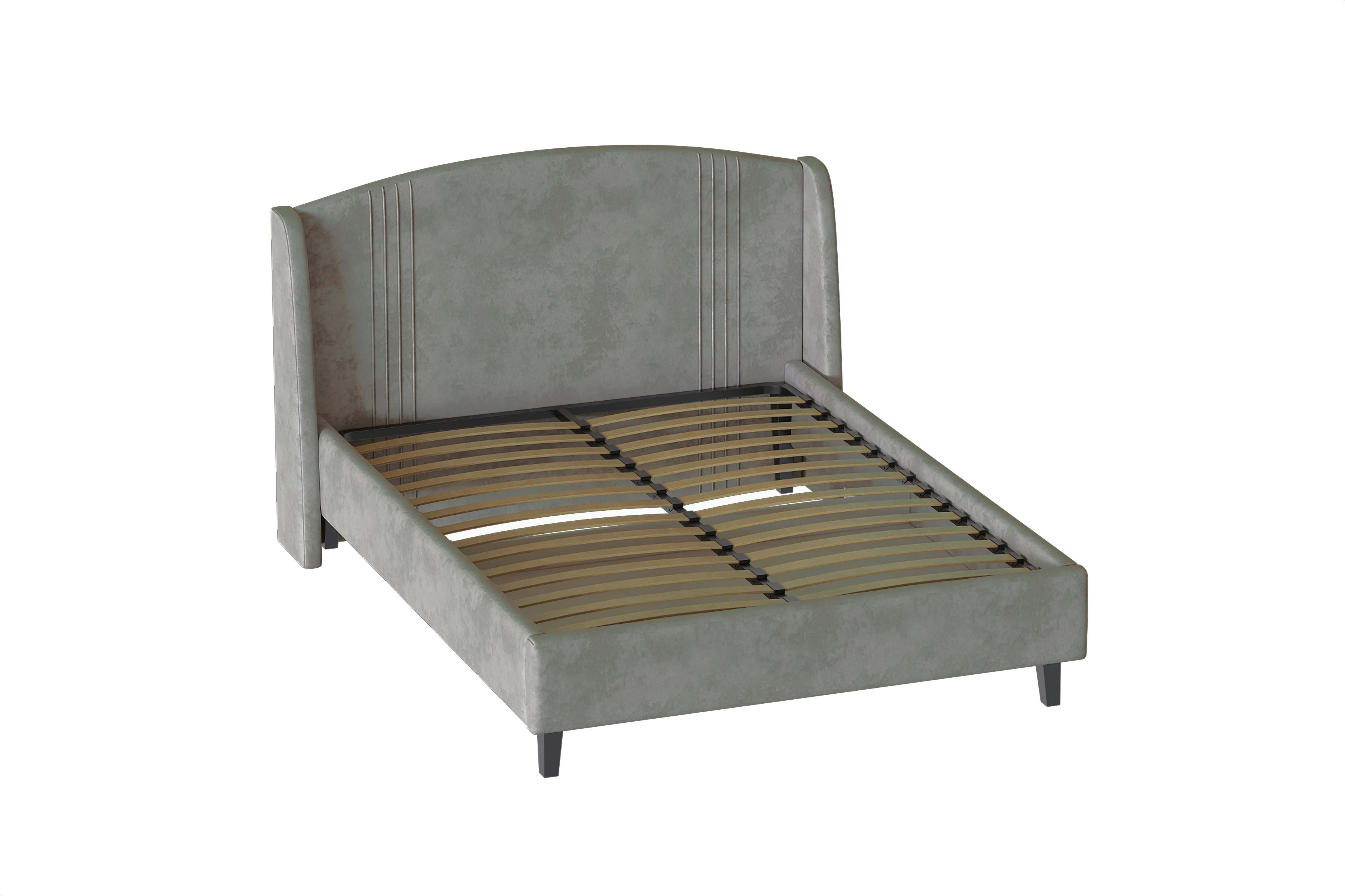 Каркас кровати обит мягким и приятным на ощупь велюром, который хорошо держит форму, устойчив к механическим воздействиям (в том числе к зацепкам от когтей животных), гипоаллергенен.