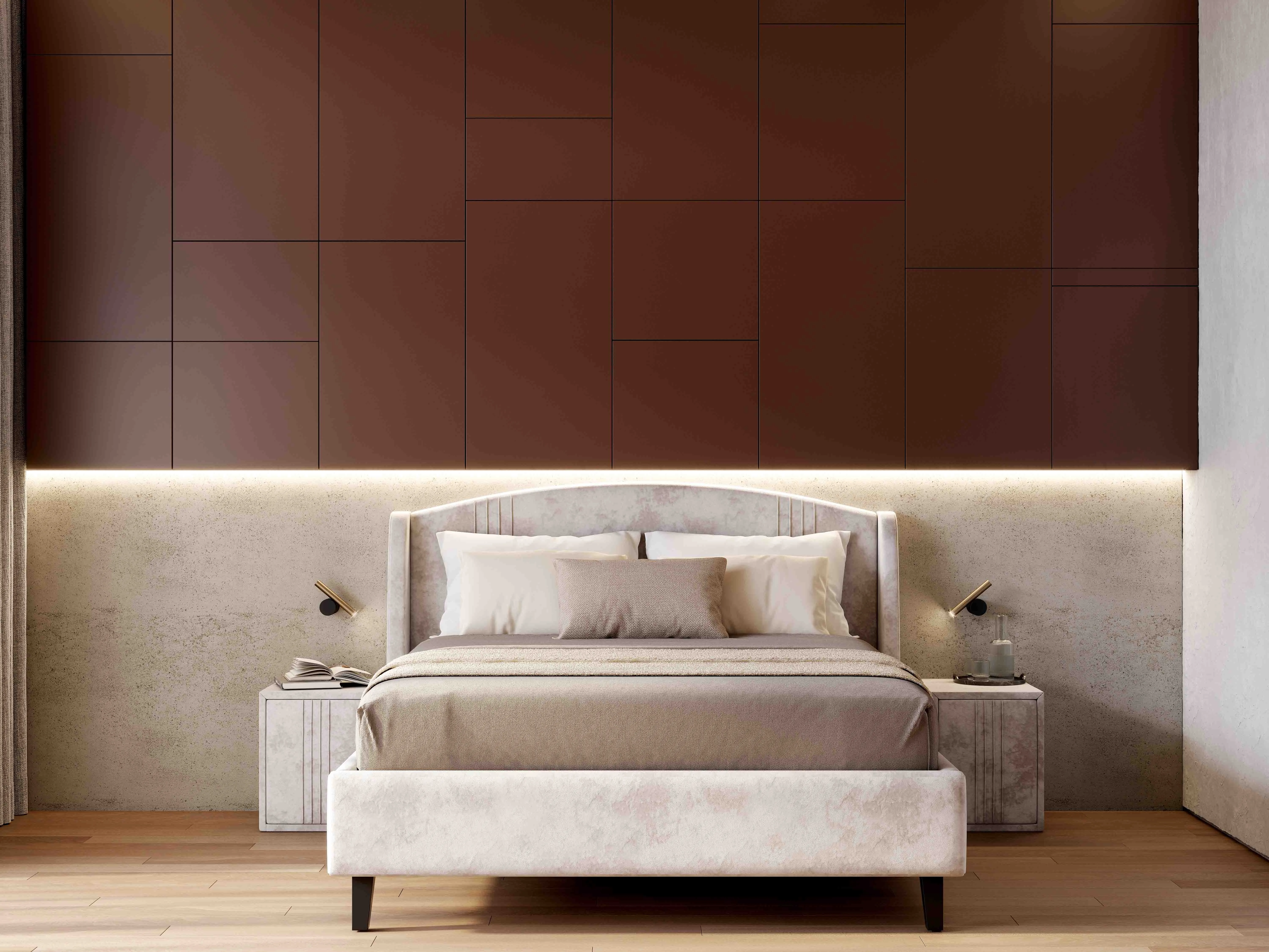 Каркас кровати обит мягким и приятным на ощупь велюром, который хорошо держит форму, устойчив к механическим воздействиям (в том числе к зацепкам от когтей животных), гипоаллергенен.
