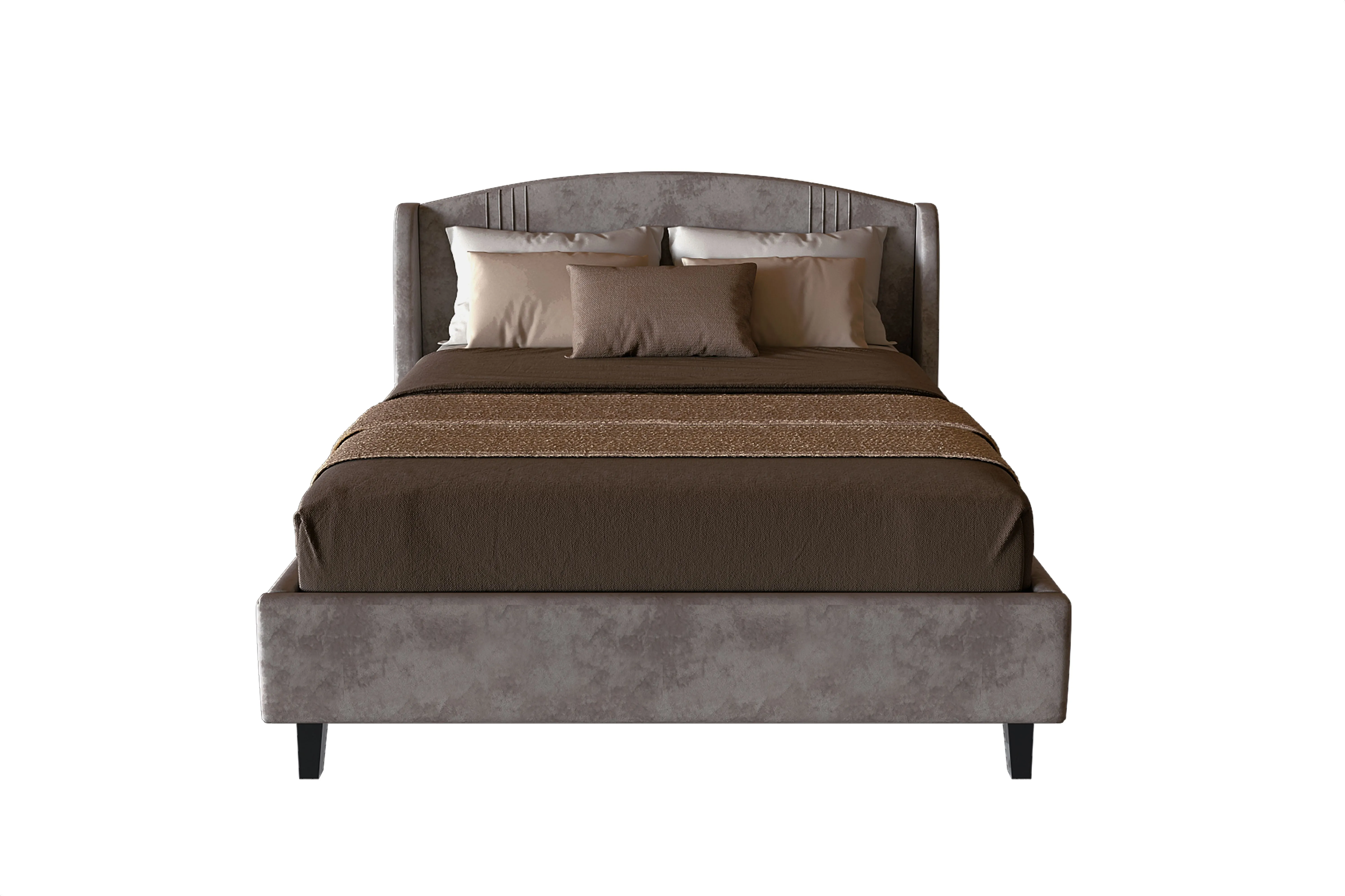 Каркас кровати обит мягким и приятным на ощупь велюром, который хорошо держит форму, устойчив к механическим воздействиям (в том числе к зацепкам от когтей животных), гипоаллергенен.