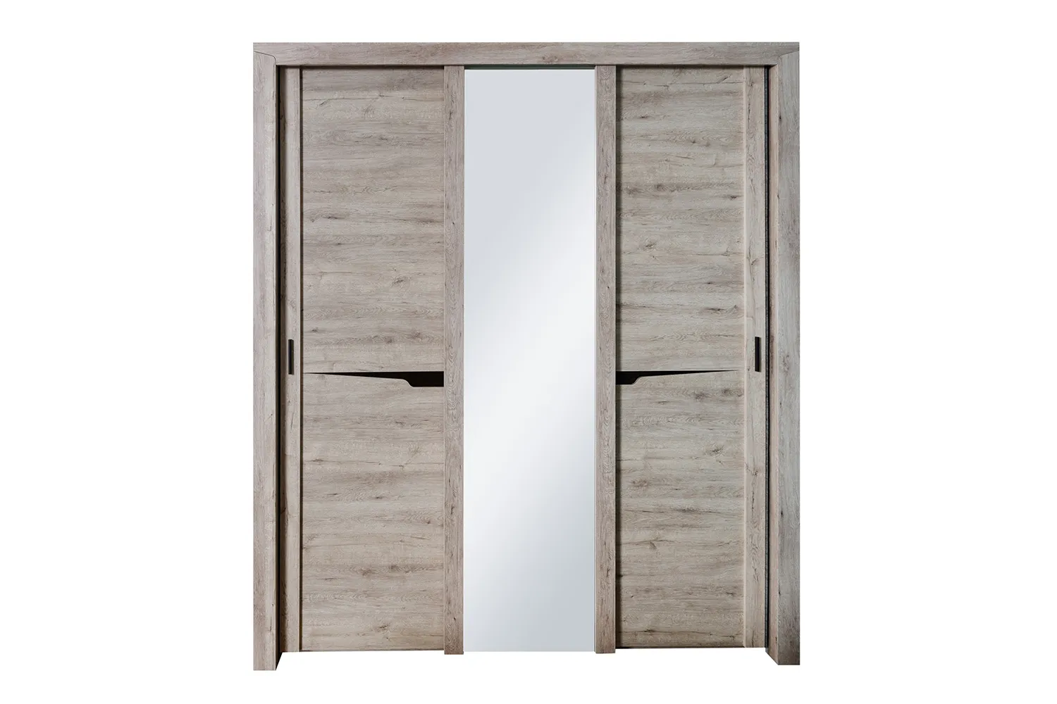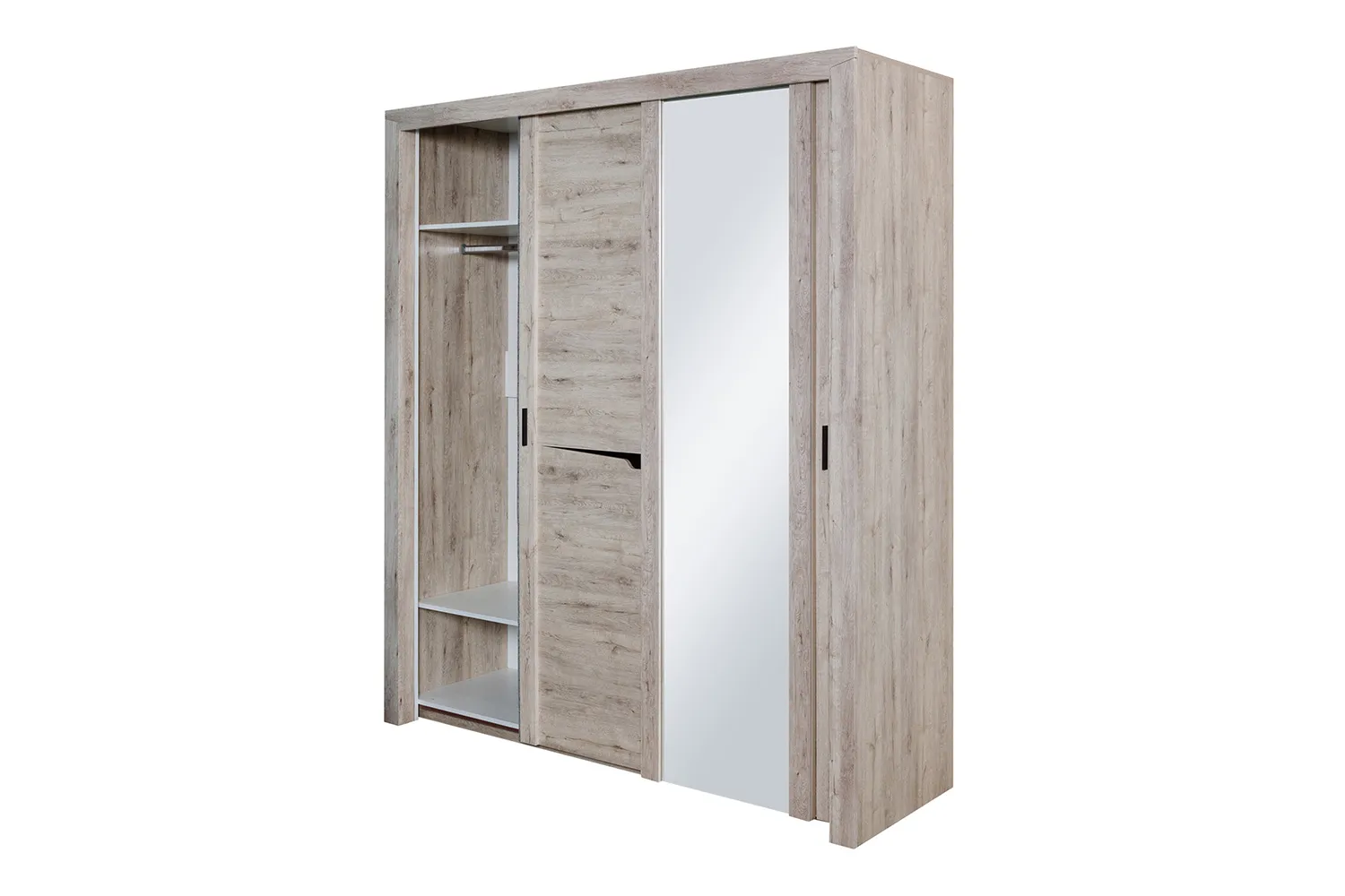 Внутреннее пространство шкафа разделено стенками на три отделения, по бокам располагаются платяные, а по центру бельевое с тремя съемными и двумя стационарными полками. В платяных отделениях установлено по одной продольной стальной штанге, над которыми размещается стационарная, а в низу съемная щитовая полка. Фасадная часть шкафа выполнена в виде трех дверей. На центральной двери наклеено зеркало, по бокам от которого закреплены две декоративные планки из МДФ. Боковые двери имеют составную конструкцию с декоративным вырезом и одной боковой планкой с установленной на ней ручкой.