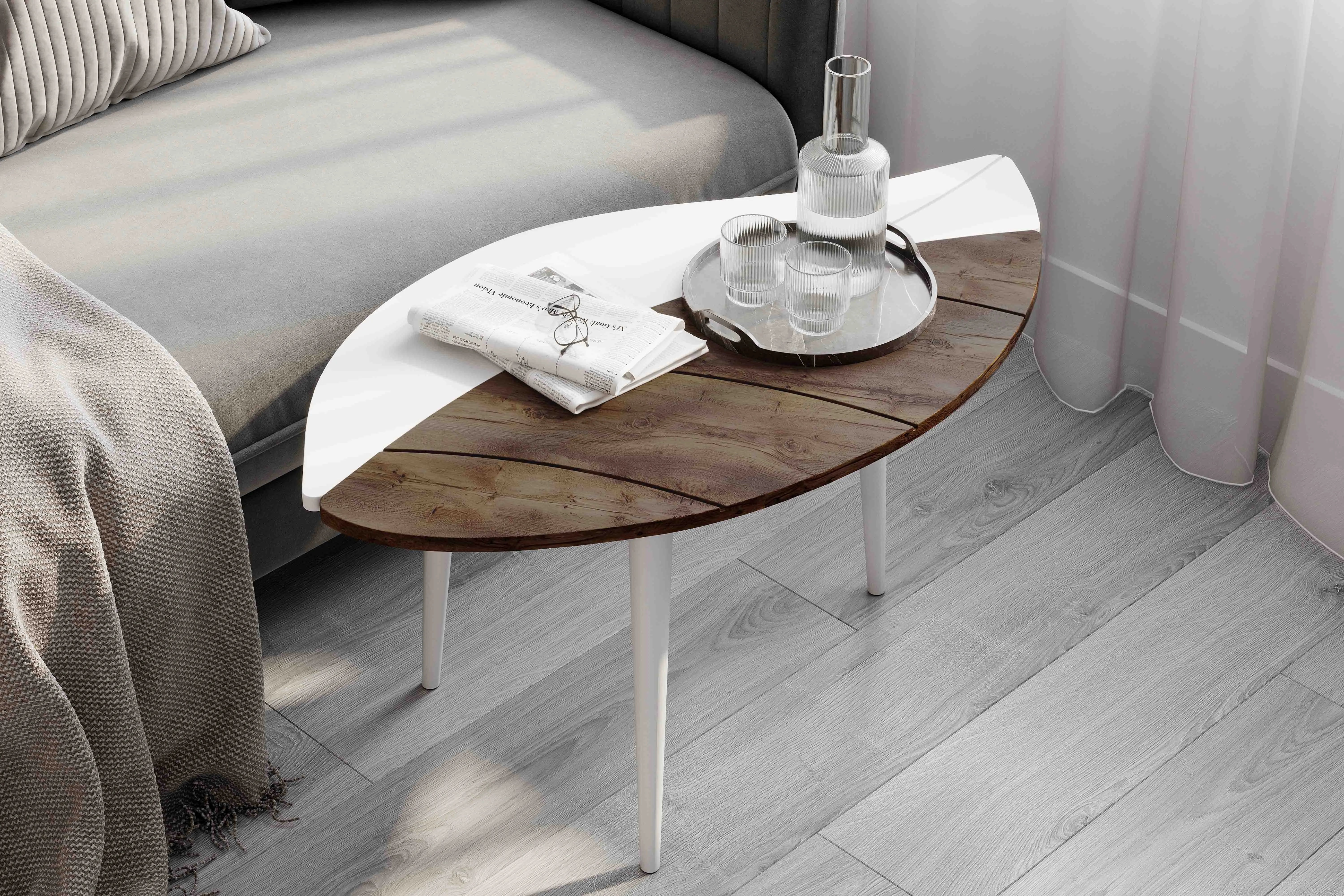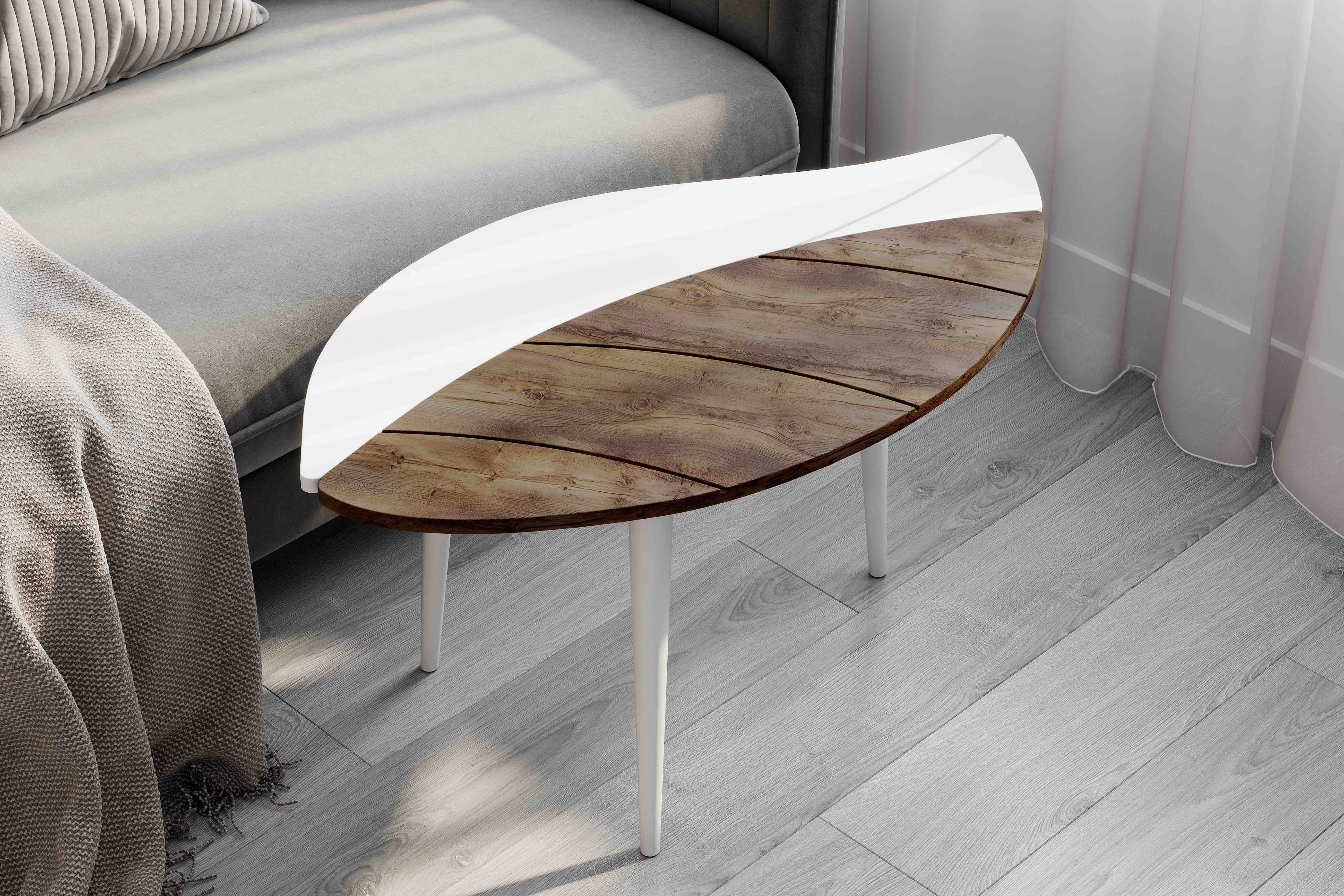 Особенностью дизайнерского решения журнального стола №17 является оригинальное сочетание фигурных элементов столешницы в форме листа дерева. Опоры выполнены из дерева.