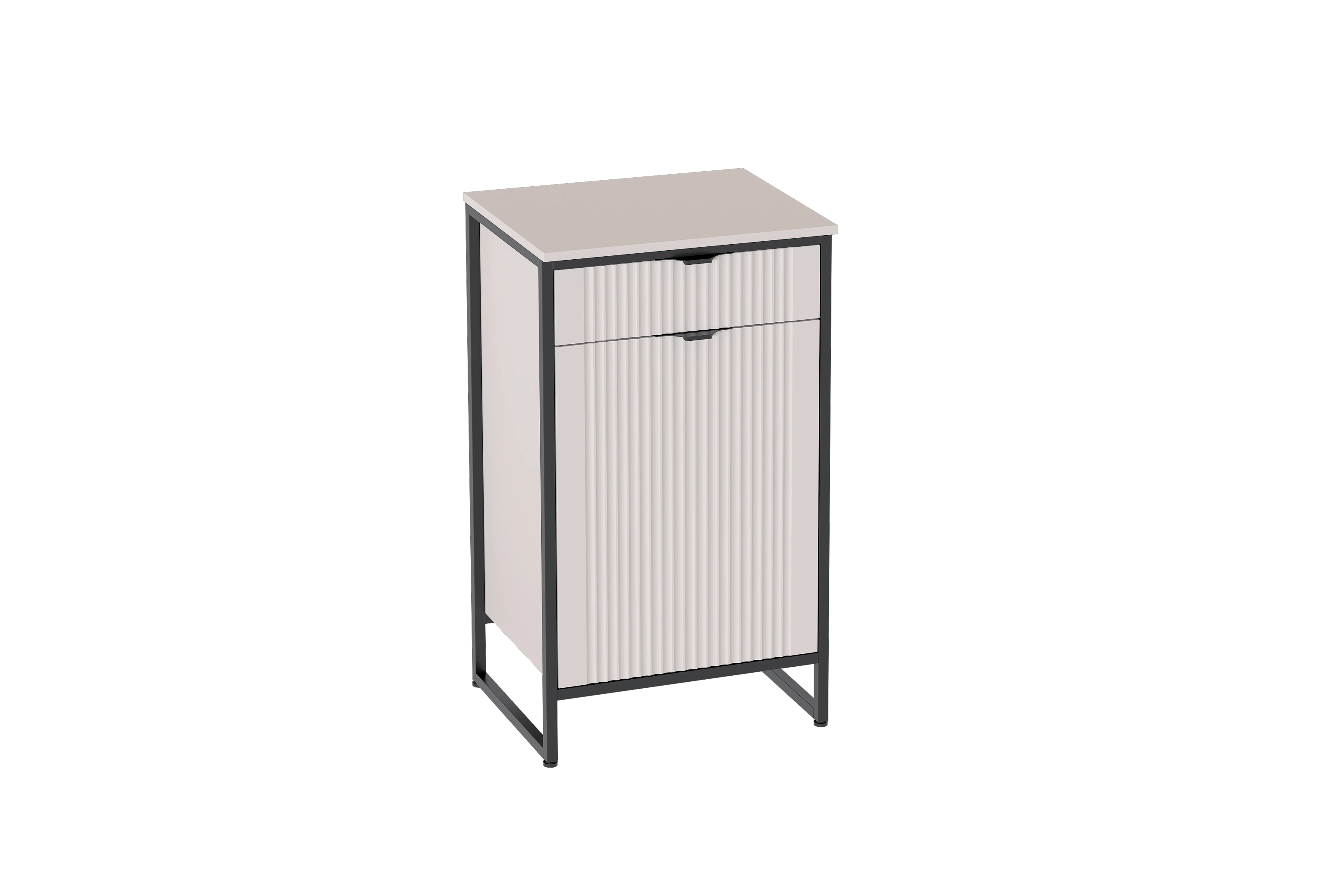 В верхней части тумбы "Нора" установлен выдвижной ящик на шариковых направляющих с доводчиками. Нижняя часть тумбы закрыта распашной дверью, за которой установлена съемная полка. Дверь может устанавливаться как на правую, так и на левую сторону и оснащена петлями с доводчиками.