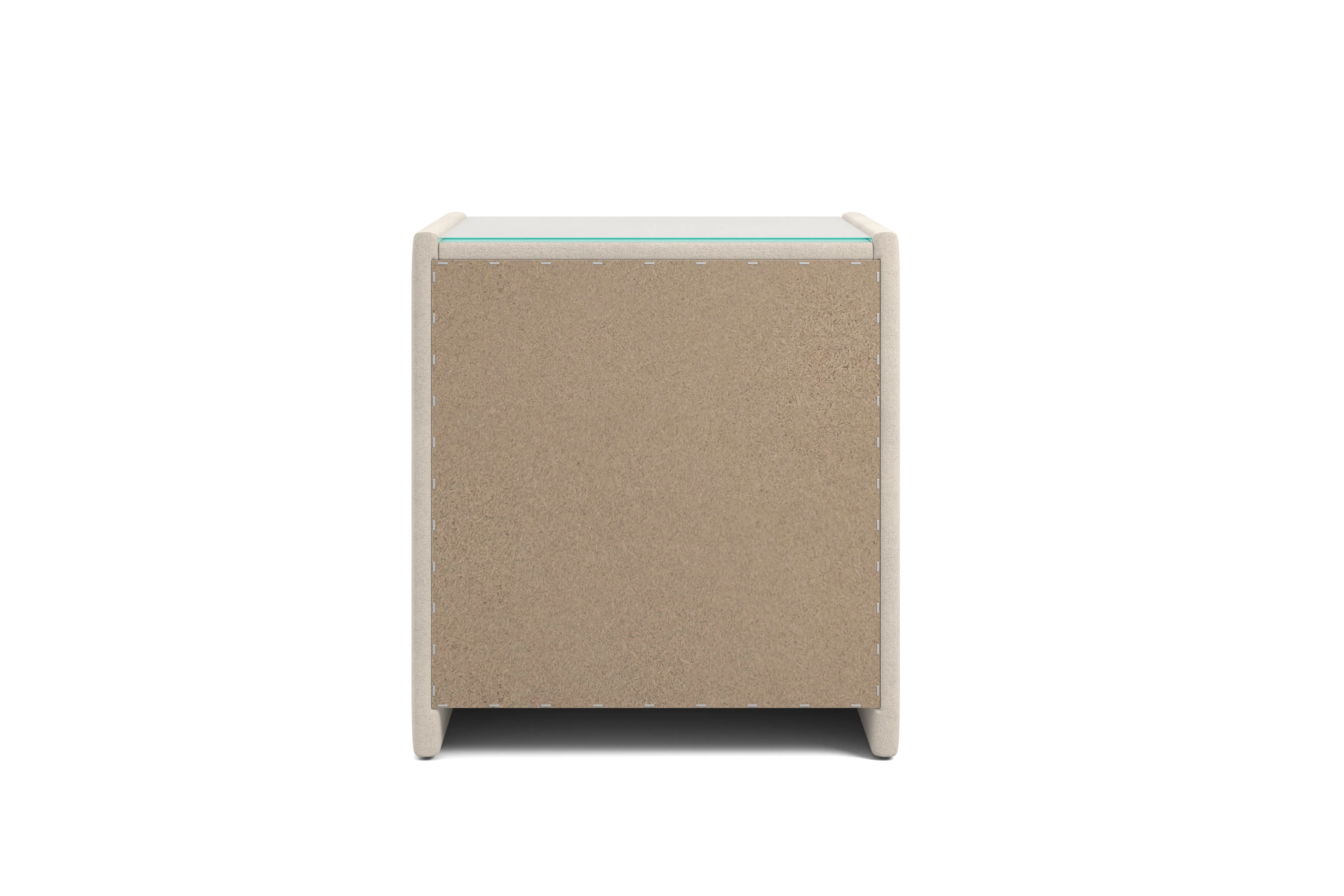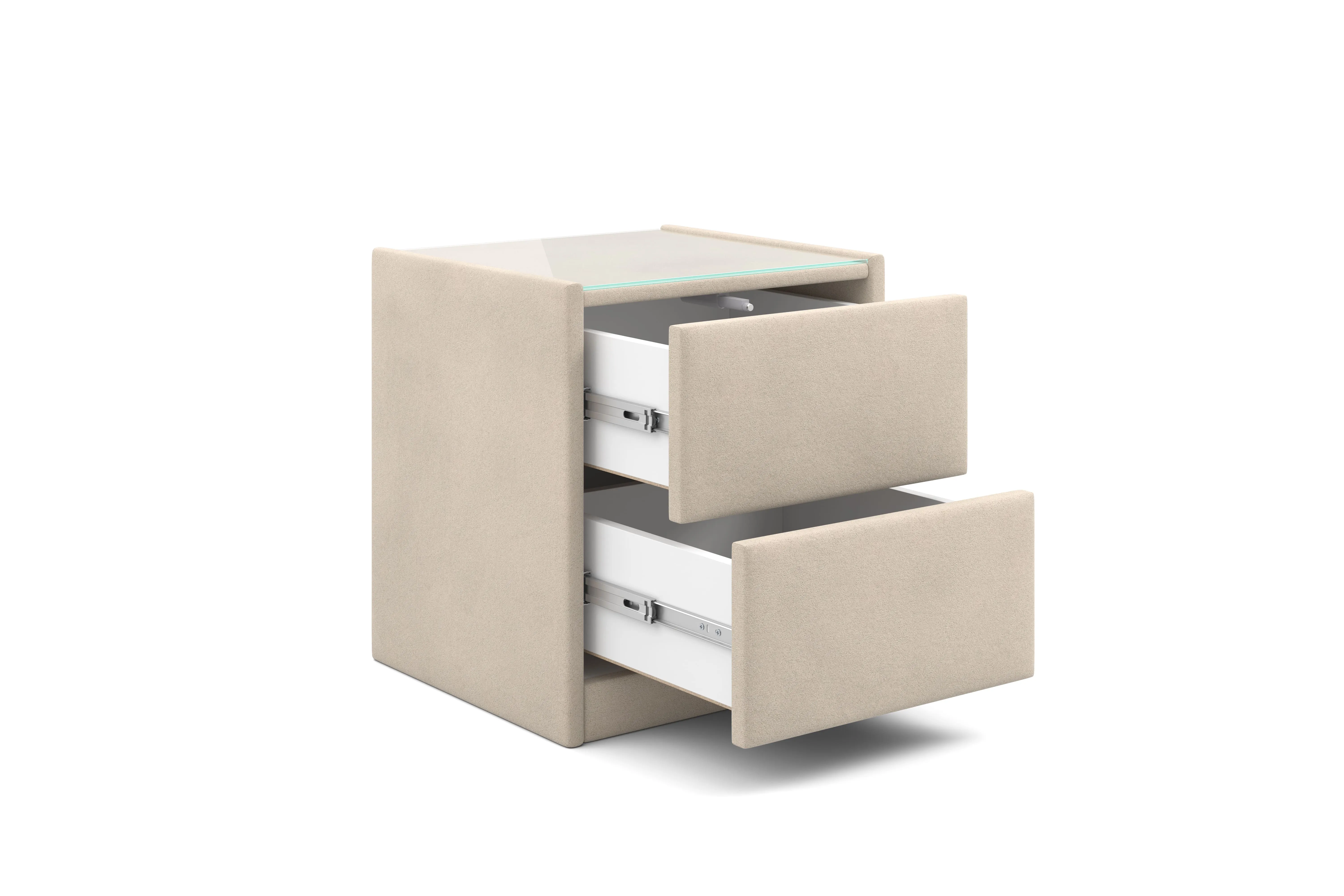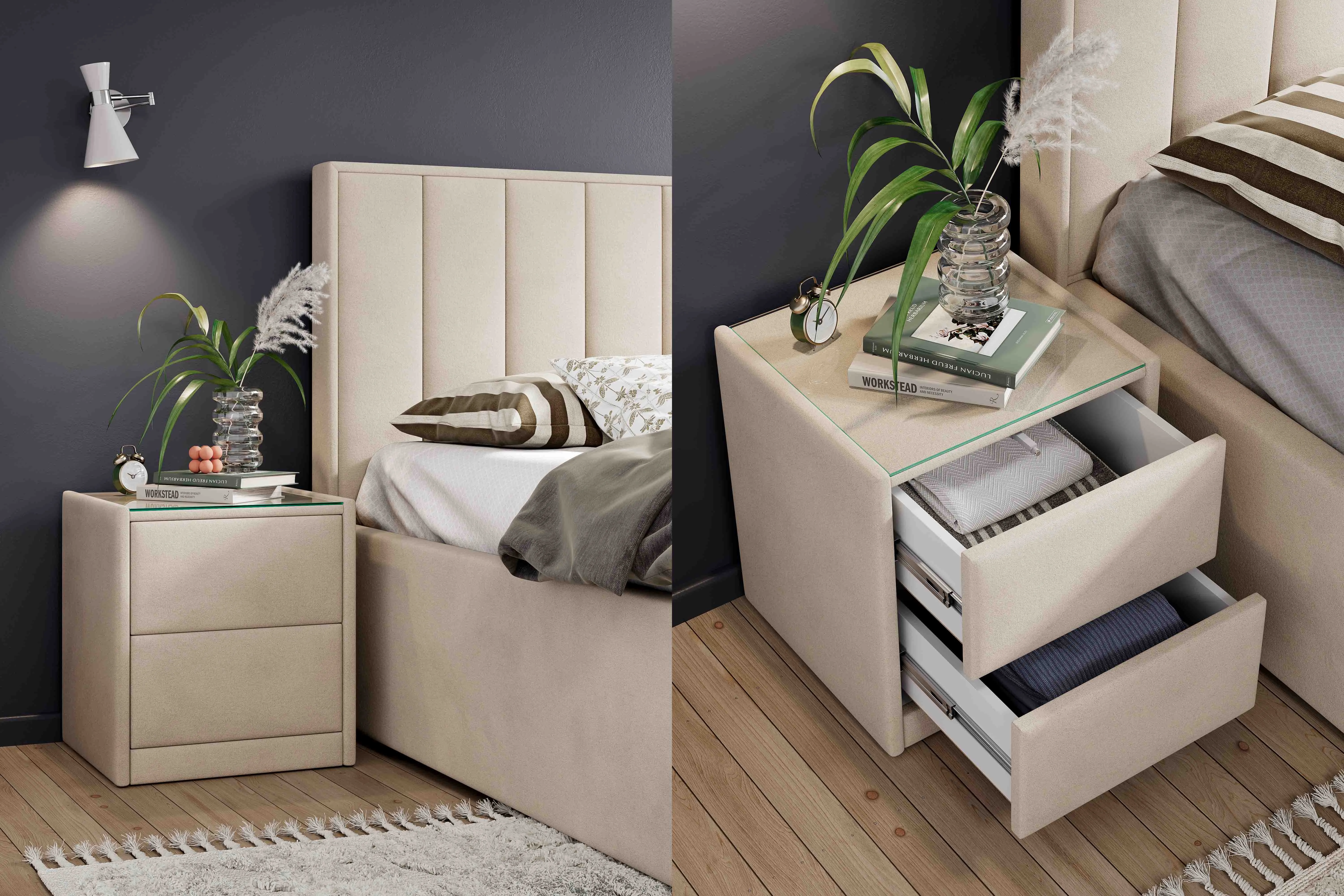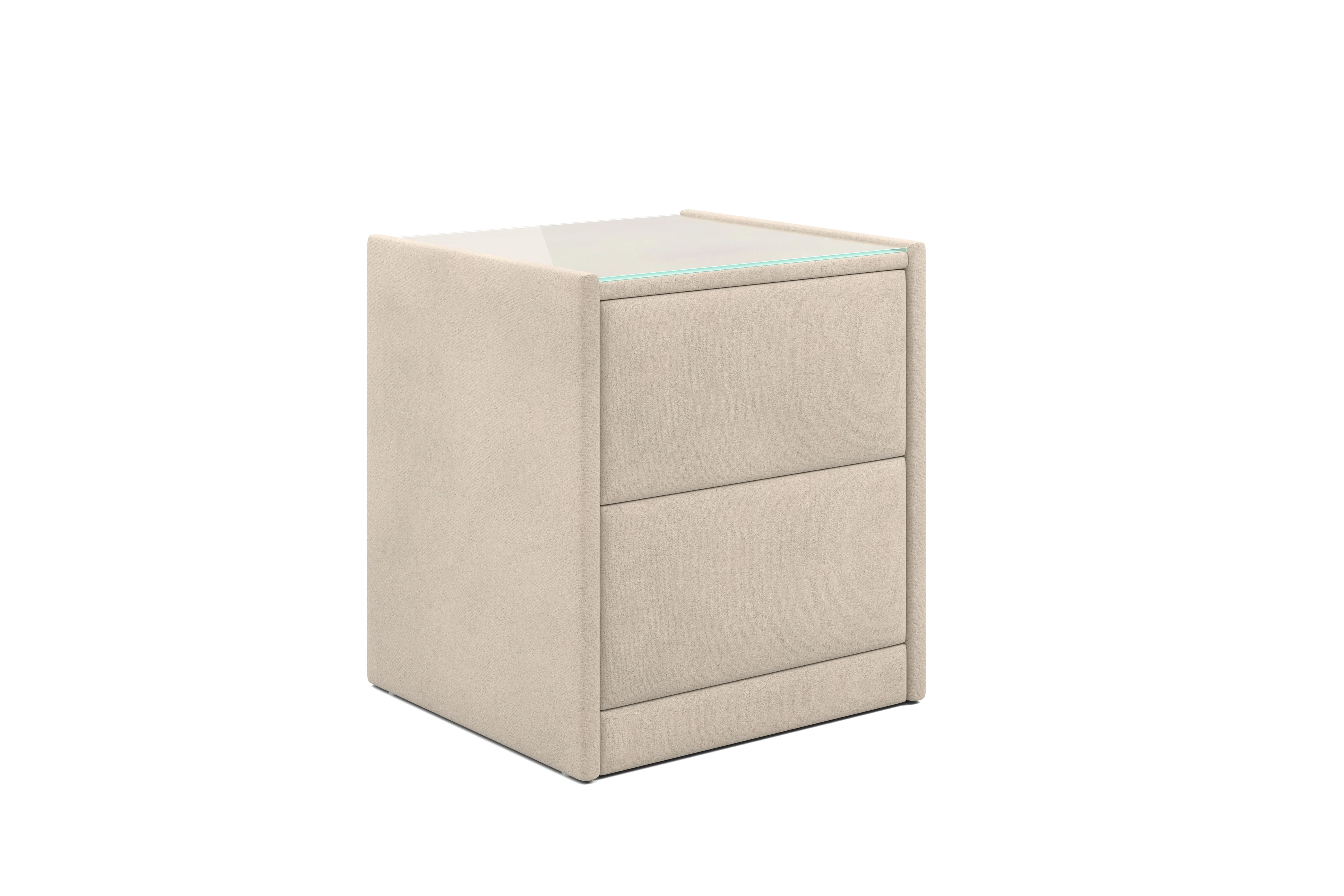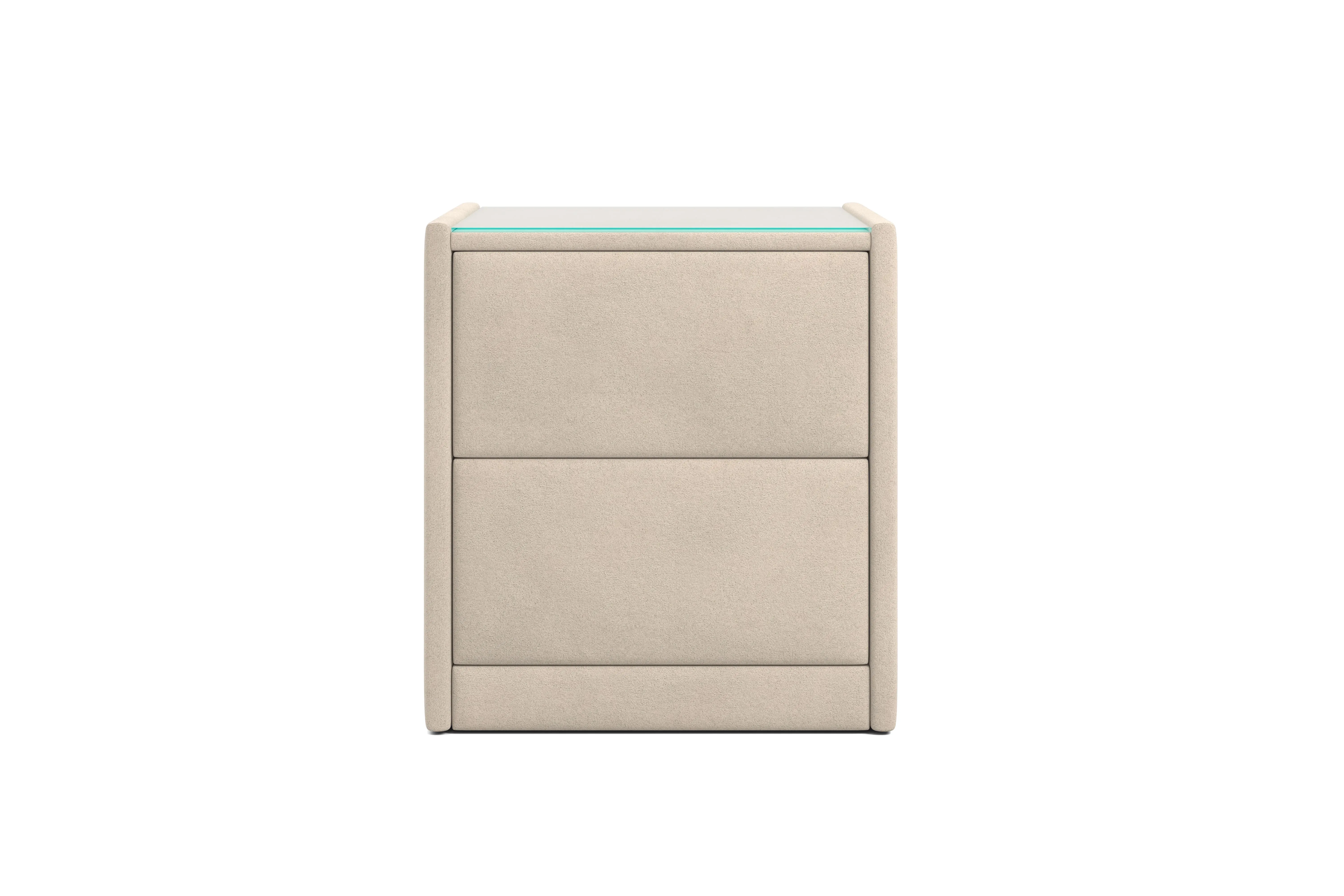 Тумба обтянута высококачественным велюром, что придает ей особый уют и комфорт. Имеет стеклянную столешницу и два вместительных выдвижных ящика с механизмом Push to open. Скругленные торцы модели, минимизируют риск удариться в темноте.