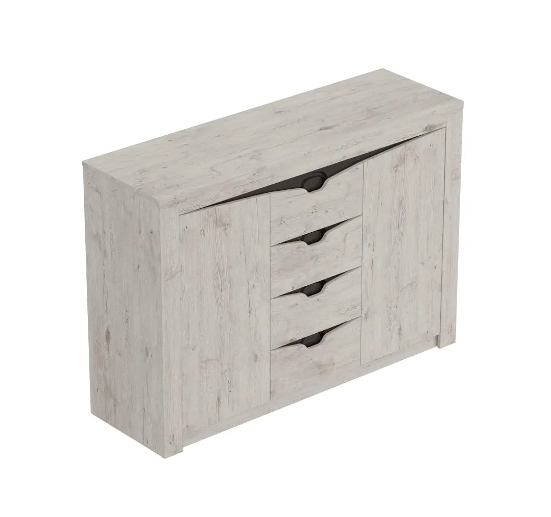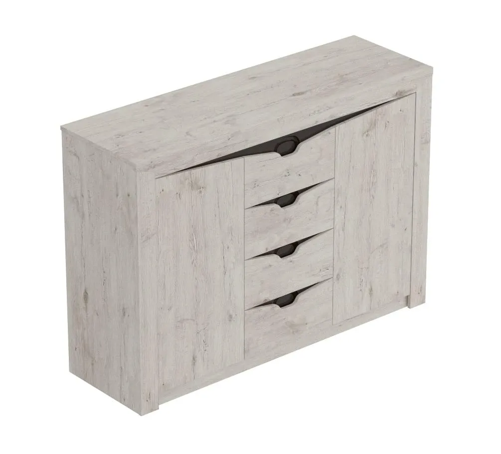 Тумба "Соренто" имеет четыре выдвижных ящика, а также два вместительных отделения по бокам с полками и распашными дверями. На фасаде имеются декоративные вырезы, выполняющие функцию ручек.