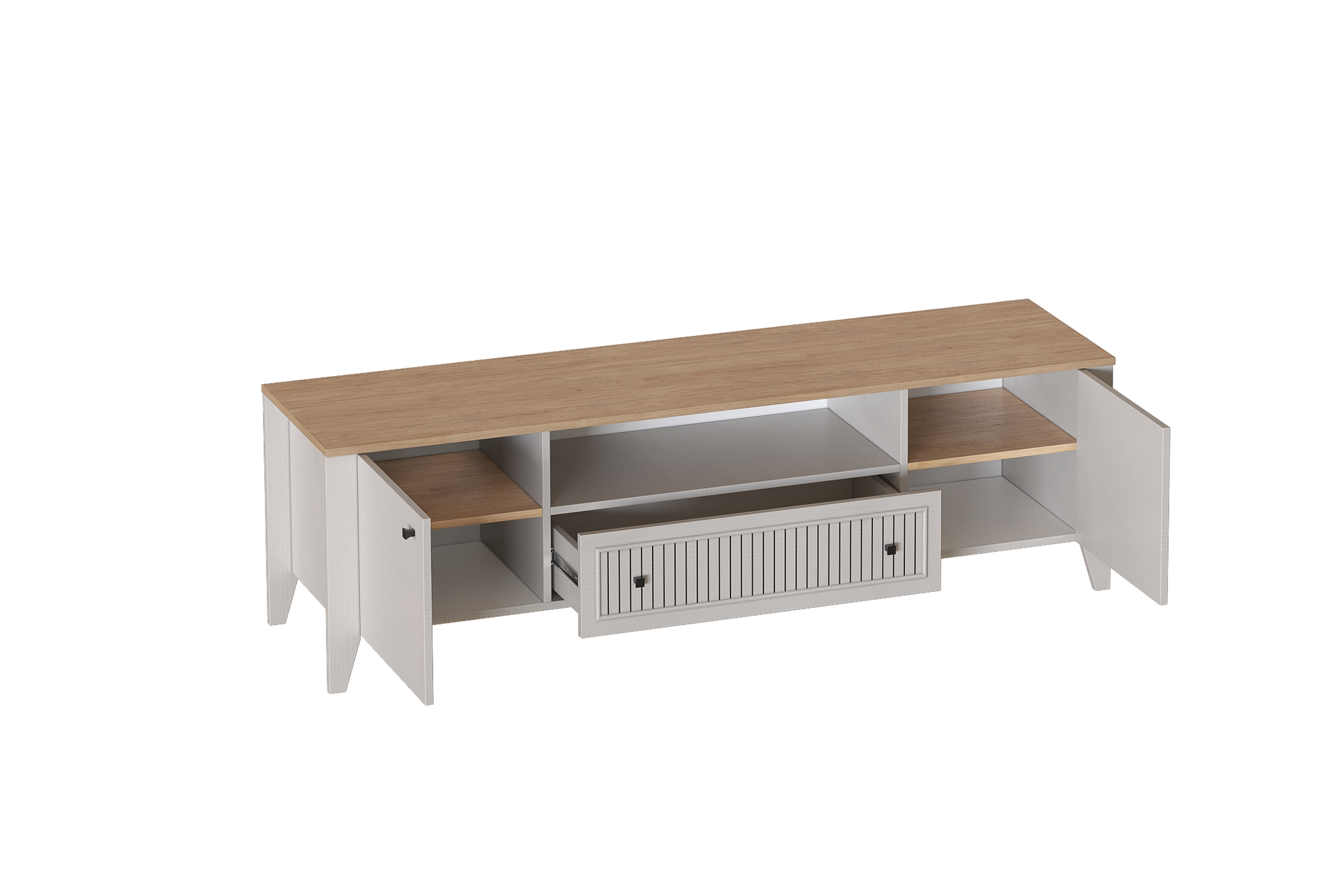 Тумба ТВ "Валенсия" выполнена в комбинации Дуб натуральный светлый / Персидский жемчуг и оснащена одним ящиком на шариковых направляющих (без амортизаторов). . Она выполнен из безопасных, качественных материалов, что гарантирует долговечность и сохранение первоначального вида на протяжении долгого времени.