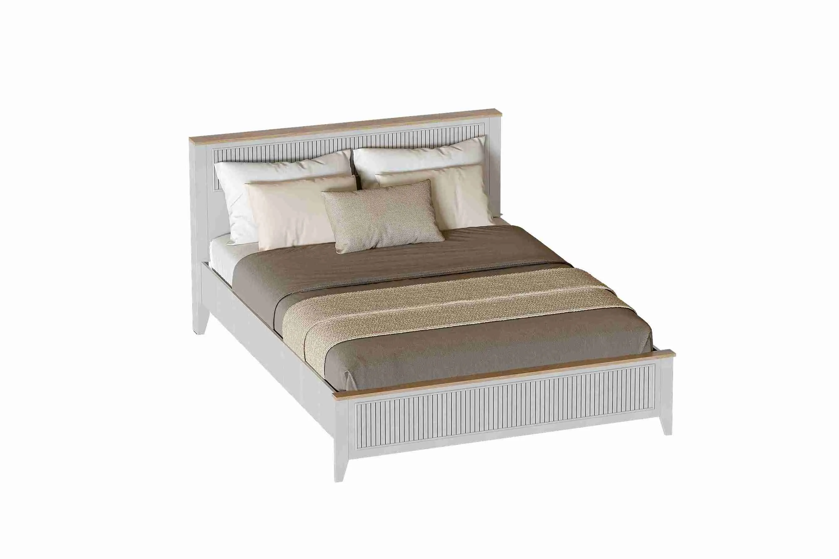 Кровать Валенсия выполнена из ЛДСП в комбинации Дуб натуральный светлый / Персидский жемчуг. УФ-фотопечать полосок на изголовье и изножье в обрамлении пластиковых молдингов придает изделию оригинальный стиль современной классики. Кроватное основание с деревянными ламелями встроено в конструкцию кровати. Высота опор 104 мм. На опорах размещены войлочные подпятники